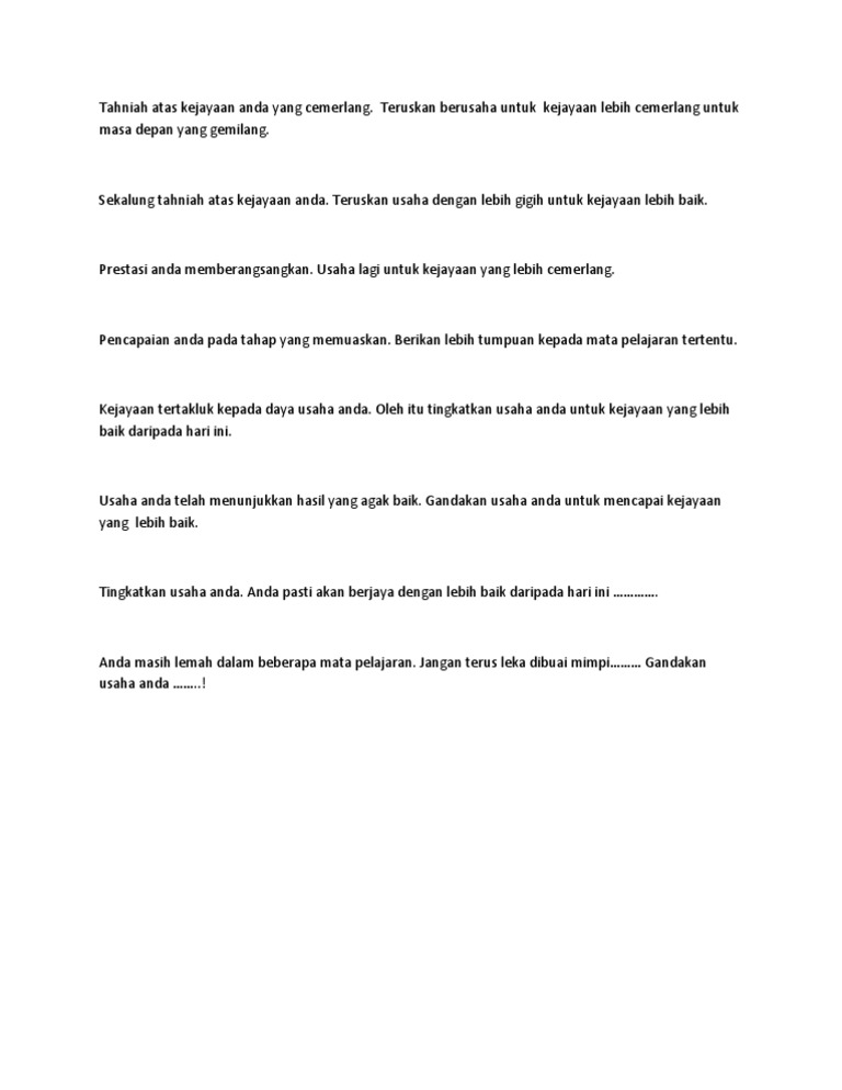 Panduan menulis ulasan slip peperiksaan murid dalam saps. Tingkatkan usaha dan ubah sikap demi masa depan anda. Anda mesti mempunyai motivasi yang tinggi dan minat terhadap pengajaran danpembelajaran didalam.